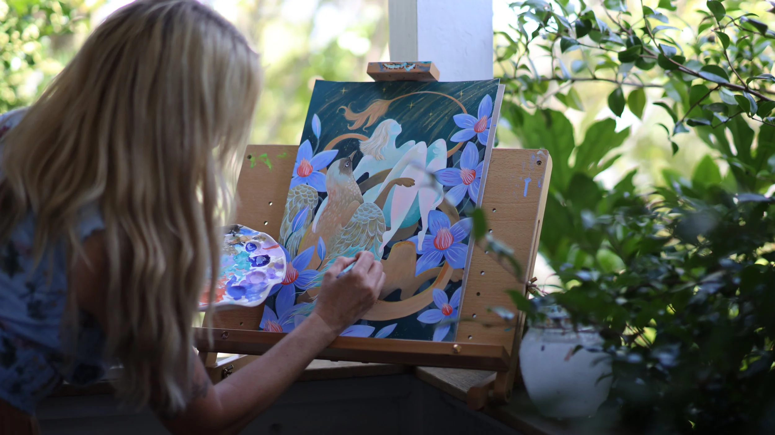 A Spirit Painting is a pretty special experience for both myself and my subject. It begins with a distance meditation where I ‘see’ the painting take shape in a lucid dream or theta-like state — these visions may reveal past, present or future timelines, people and places, animal or plant guides, colours, chakras and auras, or simply signs and symbols. All of these are imbued with deep meaning, a message of light to help guide you on your soul’s wild path.